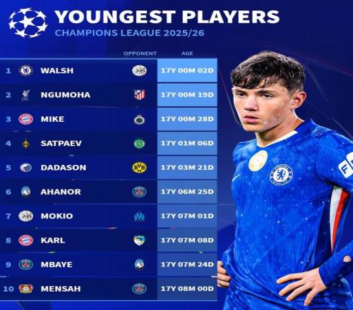 北京时间10月25日,德转统计出了本赛季至今欧冠出场最年轻的10名球员,切尔西的小将雷吉-沃尔什第一,利物浦的恩古莫哈第二,拜仁慕尼黑的威兹德姆-迈克第三。