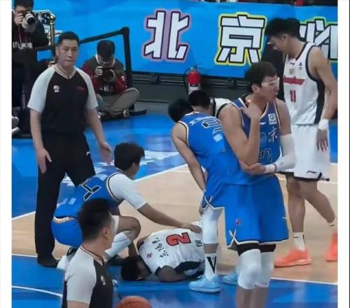 徐杰是第二节还是4分多钟时,被周琦意外撞倒的,作为大中锋,周琦体重巨大,撞到徐杰的膝盖和脚踝,让后者痛苦不堪,随后倒地不起。在徐杰受伤后,北京队立马停止了进攻,有2位北京球员更是立马采取行动,对徐杰进行关心。首先是作为前队友的赵睿,他看到徐杰受伤,指了指后,将倒地的周琦拉起,然后蹲下来慰问徐杰的情况,并紧急招手呼叫队医过来。