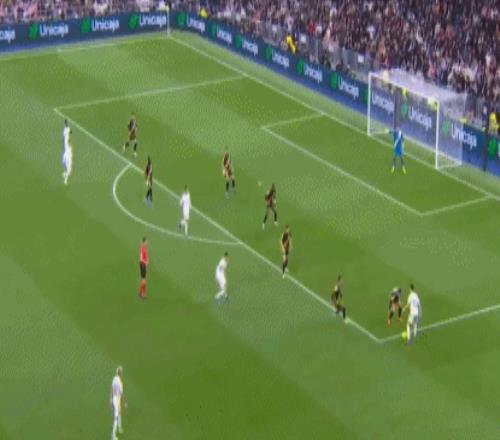 第15分钟,卜拉欣左路分球,维尼修斯禁区内连续变向,一对三完成摆脱,随即兜射轰出世界波,皇马1-0领先,熊皇终于打破13场西甲进球荒。