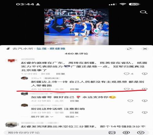 赛后,在社交媒体上出现了批评北京和赵睿的内容,据网传图片显示,北京后卫赵睿现身评论区,回复了两名IP属地新疆的球迷。